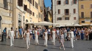 È il momento dell’esibizione sulle note di Bach dei giovani della Scuola di Ballo di Roma diretta da Paola Iorio. Vestiti color avorio catturano tutta l’attenzione fluttuando sui sampietrini scuri. De Luca non può non ricordare la grande assente, la madrina storica di questo evento, la grande Carla Fracci e tutti applaudono. Il vice brigadiere Fiorentini, trombettiere, intona il silenzio e di nuovo ci si alza in piedi. Nel pubblico, tra turisti, fotografi, forze dell’ordine, Angela Perri di WILPF Italia, Cosimo Forleo dei Disarmisti Esigenti, Virginio Massimo del Comitato Promotore contro ogni discriminazione, Pilar Castel attrice e autrice hanno dato supporto in rappresentanza della società civile.