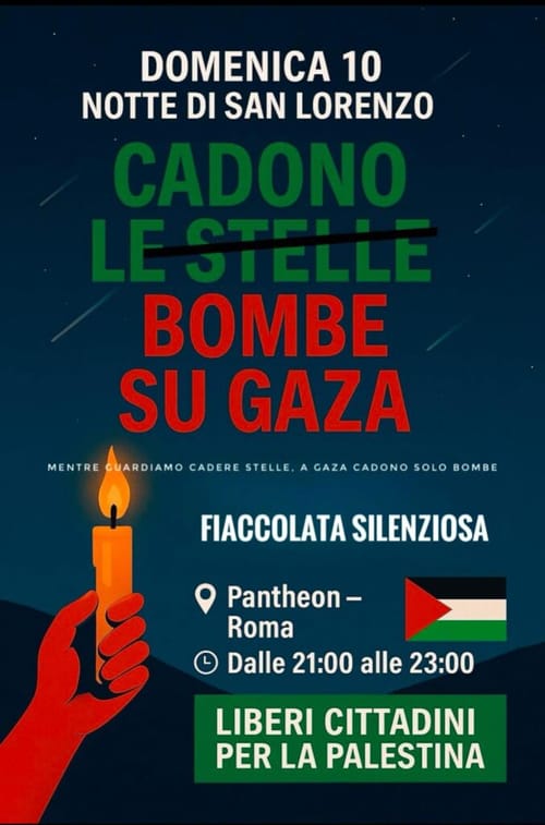 Domenica 10 agosto, dalle 21:00 alle 21:30, in piazza della Rotonda al Pantheon, manifestazione “Cadono le stelle bombe su Gaza”.
