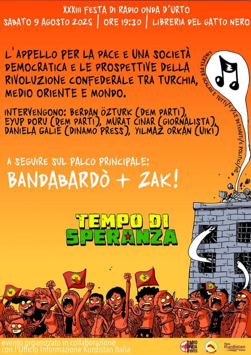 Alle ore 19.30, presso la Libreria del Gatto Nero (la libreria della Festa), discuteremo con due esponenti del Partito curdo-turco DEM, Berdan Özturk ed Eyup Doru, con i giornalisti Murat Cinar e Daniela Galiè, e con il direttore di Uiki Yilmaz Orkan della situazione in Turchia, in Siria e in Medio oriente a partire dall’appello diffuso da Abdullah Öcalan dall’isola-carcere di Imrali.
