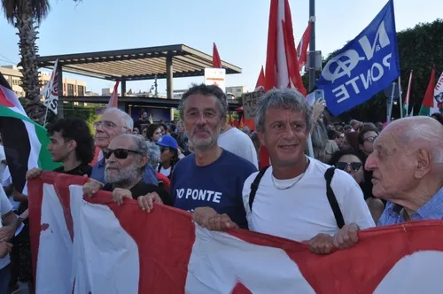 #noponte #nowar #freepalestine🇵🇸 Quante lotte e quante storie si incrociano in questa immagine del Corteo No Ponte a #Messina del 9 agosto 2025: i missili nucleari a #Comiso, le basi di morte di #Sigonella e del MUOS di Niscemi, la denuclearizzazione dello Stretto...
