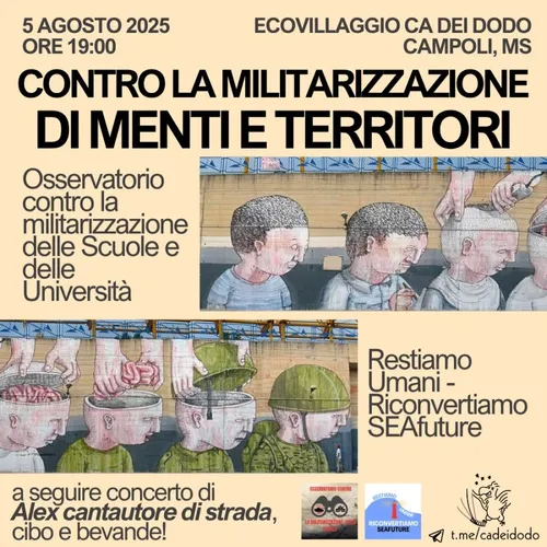 Osservatorio contro militarizzazione di scuole e università - Wednesday, August 13, 2025Si è svolto il 5 agosto nell’Ecovillaggio Ca dei Dodo nella frazione di Campoli di Mulazzo (MS), fra i boschi della Lunigiana, un aperitivo musicale che ha permesso di riflettere sugli inquietanti aspetti comunicativi e propagandistici della narrazione bellica attuale in un contesto di pacifico confronto.