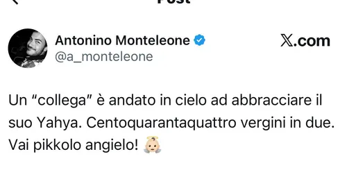 Contropiano - Friday, August 15, 2025Il mostruoso post su X di tale Antonino Monteleone, che si presenta come “giornalista” che ha lavorato in RAI a Mediaset e a La7 e che così ha festeggiato l’assassinio dell’eroico giornalista palestinese Anas al-Sharif, è solo la punta dell’iceberg. Queste parole infami fanno da contorno alle pagine vergognose de […]