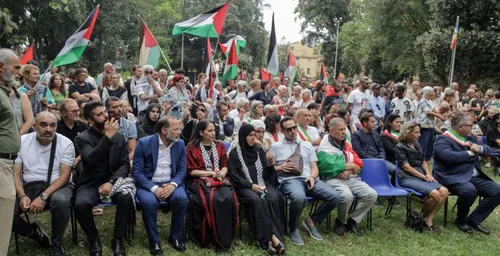 A questi sono seguiti altri interventi degli Imam di Firenze e Pisa, di AssoPace, e delle istituzioni locali. Per ultimo è intervenuto il presidente della regione Eugenio Giani, accolto dal pubblico con fischi e cori per la Palestina libera. Giani non ha perso occasione per rivendicare in piena campagna elettorale la recente approvazione della delibera per il riconoscimento dello Stato di Palestina da parte della Regione Toscana. Intervento certamente tardivo e strumentale, la cui benevolenza è stata tradita dalle risate fuori schermo – e fuori luogo – contornate da accattonaggi elettorali di Giani ed équipe di partito sulle elezioni regionali di ottobre.