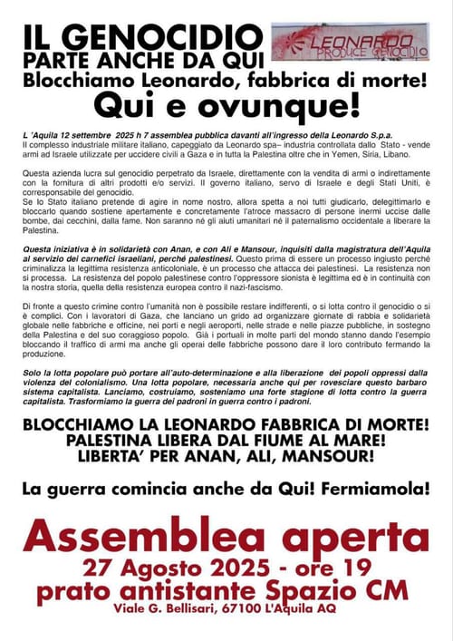 Radio Onda Rossa - Wednesday, August 27, 2025Con un compagno del Coordinamento di Solidarietà con il Popolo Palestinese (Roma), abbiamo parlato dell'assemblea aperta di oggi, mercoledì 27 agosto a L'Aquila, per continuare la lotta contro la guerra capitalista e in solidarietà con Anan, Ali e Mansour, i tre palestinesi detenuti in Italia per richiesta dello Stato sionista d'Israele. Lui ci ha raccontato come proseguirà il processo contro i tre militanti palestinesi, con le prossime tre udienze a settembre, e ci ha ricordato l'assemblea pubblica del 12 settembre davanti all'ingresso della Leonardo S.p.a.
