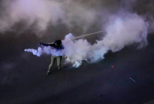 Gli agenti della polizia di Stato lanciano gas lacrimogeni nel tentativo di disperdere la protesta, mentre alcuni nella folla li rilanciano al mittente.