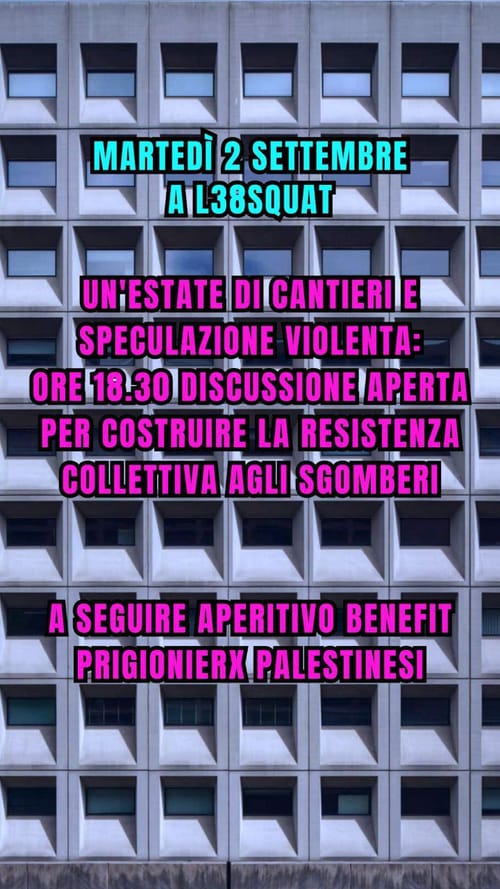 Come collettivo che autogestisce L38Squat - il Centro sociale del sesto ponte - chiamiamo tuttx a raccolta per discutere gli sviluppi in corso nelle nostre situazioni e per aggiornare la nostra rete di relazioni su cosa sta cambiando velocemente nel nostro quartiere.