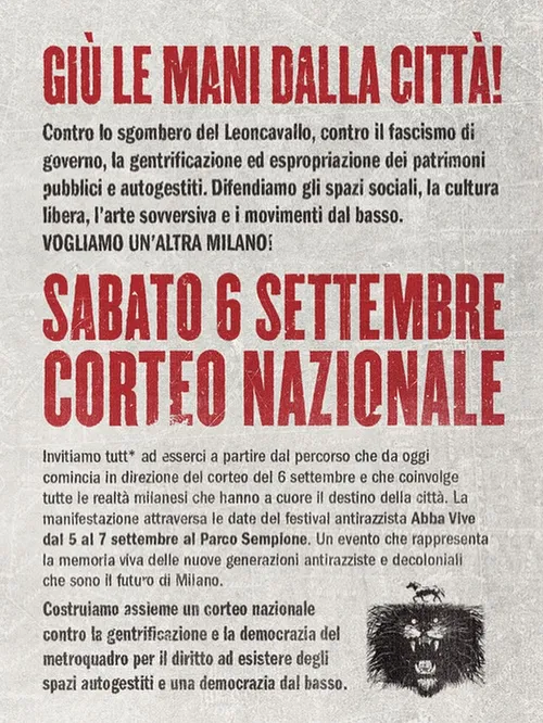 Assemblea e corteo si muovono attorno alle parole d’ordine “Giù le mani dalla città! In difesa degli spazi pubblici e sociali autogestiti, contro la gentrificazione, per il diritto all’abitare, contro la speculazione edilizia, il saccheggio delle olimpiadi Milano Cortina e i padroni delle città! Vogliamo costruire un grande corteo il 6 Settembre per un’altra Milano e per tutte le città sempre più segnate da zone rosse, limitazioni, biglietti di ingresso, selezioni obbligate. Lo sgombero del Leoncavallo è una evidente conseguenza delle trasformazioni avvenute a Milano a partire dal piano urbanistico. Modello che si vorrebbe estendere altrove. Ma è anche vendetta del potere contro chi prova a resistere. La mano del governo è calata sul vecchio Leo, nel 50esimo anno della sua storia, per avviare la campagna elettorale della destra, a trazione Fratelli d’Italia, verso le prossime elezioni comunali. È una legalità fatta di odio verso chi è stranier@ e/o espuls@, pover@ una legalità che porta all’isolamento sociale chi vive disabilità e fragilità psicologiche. Che giustifica la violenza fino alla tortura e al genocidio. Gli spazi sociali, culturali, artistici, autogestiti o no, occupati o dell’associazionismo, sono l’antitesi del fascismo di governo, così come il conflitto sociale, che vede nell’occupazione uno strumento di livellamento delle sempre più crescenti differenze sociali, un fondamento del dibattito democratico di un paese e delle città. Noi abbiamo un’altra idea di città e di mondo che da cinquant’anni a oggi è cambiata e si è fatta anche transfemminista, intersezionale, antiabilista, una città a tutela delle agricolture contadine e dei loro territori aggrediti, per l’accesso al cibo come nutrimento culturale. La manifestazione attraversa le date del festival antirazzista Abba Vive dal 5 al 7 Settembre al Parco Sempione. Un evento che rappresenta la memoria viva delle nuove generazioni antirazziste e decoloniali che sono il futuro di Milano. Costruiamo un corteo che tenga insieme generazioni diverse ed esperienze politiche differenti. La città orizzontale contro il verticalismo del potere”. L’intervista su Radio Onda d’Urto con Luciano Mulhbauer, compagno meneghino e nostro storico collaboratore. Ascolta o scarica
