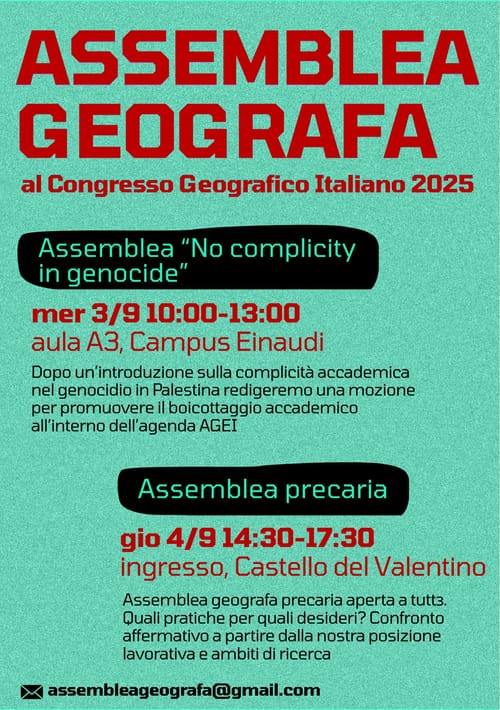 L’assemblea geografa ha così deciso di disertare l’assemblea plenaria del CGI convocando l’assemblea parallela “No Complicity in Genocide” che si terrà presso l’Aula A3 del Campus Einaudi alle ore 10.00 in contemporanea, nella quale discutere le forme di complicità accademica con il genocidio in Palestina, e redigere una mozione per l’adozione di linee guida di boicottaggio accademico da presentare all’Associazione dei geografi Italiani e agli altri sodalizi geografici. Riteniamo grave che in questo momento storico la Geografia non prenda posizioni nette sul genocidio in corso perpetrato da Israele, riconosciuto ormai da più fronti e non soltanto nel campo del diritto internazionale. Riteniamo inoltre che le università debbano tornare ad essere luoghi capaci di interrogarsi sulle proprie responsabilità ed implicazioni politiche ed etiche nel complesso militare-industriale e nelle economie del genocidio di cui moltissime, anche in Italia, sono complici. Il Congresso Geografico Italiano rappresenta un momento collettivo della nostra comunità scientifica, che riteniamo debba fondarsi su pratiche coerenti con i valori di giustizia, solidarietà e responsabilità globale contro il colonialismo e le guerre.