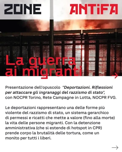 No cpr, No frontiere Libertà! - Thursday, September 4, 2025Presentazione dell’opuscolo “Deportazioni. Riflessioni per attaccare gli ingranaggi del razzismo di stato” con l’assemblea NOCPR Torino, Rete Campagne in lotta e l’assemblea NOCPR FVG. Sabato 6 settembre, ore 16, San Giusto (Trieste), nell’ambito di ZONE ANTIFA, una tre giorni di dibattiti, lotta e festa organizzata in seguito all’operazione repressiva che ha colpito alcunx compagnx a […]