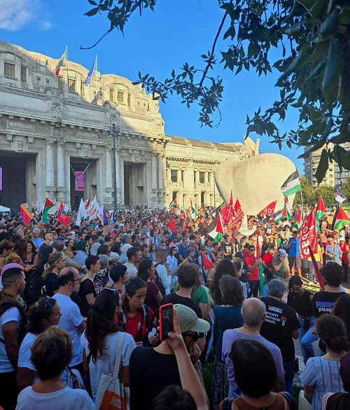 GLOBAL SUMUD FLOTTILLA: CENTINAIA DI PERSONE AL PRESIDIO SOLIDALE DAVANTI ALLA STAZIONE CENTRALE DI MILANO