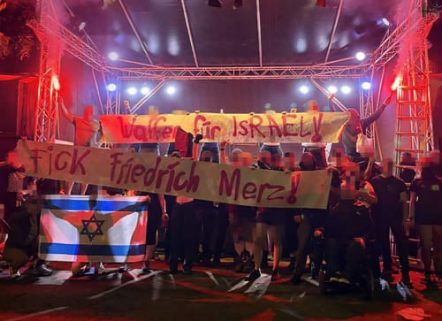 Negli ultimi tempi, inoltre, il cancelliere, sebbene in modo assai poco credibile ha annunciato l'interruzione della vendita di armi a Israele (la Germania è il secondo fornitore al mondo di armi a Israele dopo gli Usa), questo è bastato a far scattare la componente antideutsch de* antifa che chiedono ancora armi a Israele, sebbene con minor presa rispetto al passato sul testo del movimento.