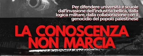 Al fine della smilitarizzazione dell’istruzione e della separazione netta tra spazio scolastico/universitario e ambito militare, la campagna “LA CONOSCENZA NON MARCIA” CHIEDE MISURE NORMATIVE PER IMPEDIRE LE SEGUENTI INZIATIVE nel sistema dell’istruzione scolastica ed accademica: sviluppare progetti di didattica, ricerca e Terza missione in collaborazione con industrie della filiera bellica, con istituzioni, incluse le università, di Paesi che attuano sistematicamente politiche e pratiche genocidarie, di oppressione coloniale, di segregazione e pulizia etnica, come Israele, e con organizzazioni internazionali (ad es. la NATO), che intervengono direttamente ad alimentare gli scenari di guerra in corso e le politiche di riarmo; partecipare, da parte dei singoli docenti, a organizzazioni che abbiano finalità di tipo militare o che siano legate all’industria bellica (ad es. Med-Or); ricevere finanziamenti, stringere partnership con aziende della filiera bellica e con realtà produttive che collaborano con governi che non rispettano il diritto internazionale (crimini di guerra, occupazione militare illegale, discriminazione razziale e persecuzioni); sviluppare corsi, master, scuole di specializzazione, eventi e iniziative didattiche e di orientamento nelle università e nelle scuole di ogni ordine e grado in collaborazione con le forze armate e con le forze dell’ordine, le quali devono restare fuori dal sistema educativo. Abbiamo deciso di non marciare per le loro guerre. Abbiamo deciso di difendere i luoghi della conoscenza da quelle ingerenze governative e dagli interessi dell’industria bellica e delle istituzioni sioniste che corrompono e deteriorano il sapere. Lottiamo per garantire un’istruzione ed una ricerca sane, forti e indipendenti per demilitarizzare e decolonizzare la cultura, anche in una prospettiva internazionale.