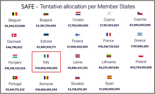 Sono 19 i Paesi dell’Unione Europea che hanno deciso di accedere ai prestiti europei per il riarmo e in questi giorni è stata resa la ripartizione dei fondi dalla apposita Commissione (la foto con cui abbiamo aperto l’articolo). I prestiti serviranno anche per investimenti tecnologici in ambito militare, per la produzione di missili e sistemi di arma, per droni e anti drone, non esiste settore escluso nell’ottica di ampliare la produzione nazionale, per acquisire le competenze tecnologiche indispensabili a dare vita a un articolato e sinergico sistema a livello comunitario.