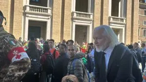 Dalla notizia della sua presenza all’apparizione dal Braccio di Carlo Magno (situato a sinistra della Basilica entrando da via della Conciliazione) dove seguivo le esequie, arrivare nella piazza è trascorso un solo attimo. Non si trattava di una ricerca della notizia sensazionalistica, ma di una constatazione della realtà: Julian Assange era davvero lì, riservato, rispettoso, delicato, timido, ma presente. Con i figli e sua moglie, senza cercare facile visibilità.