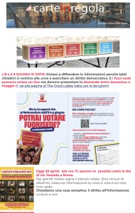 carteinregola - Tuesday, April 29, 2025L’8 e il 9 GIUGNO SI VOTA! Aiutaci a diffondere le informazioni perchè tanti cittadini si rechino alle urne a esercitare un diritto democratico. E i fuori sede possono votare […]