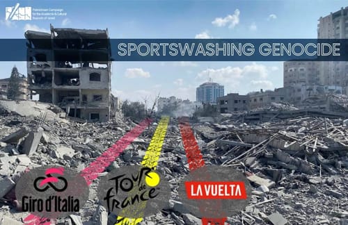 Il Giro d’Italia (9 maggio – 1 giugno), il Tour de France (5 – 27 luglio) e la Vuelta a España (23 agosto – 14 settembre) stanno vergognosamente consentendo alla squadra ciclistica che rappresenta Israele, Israel Premier Tech, di partecipare. Nel frattempo, Israele continua l’assalto a Gaza, uccide migliaia di persone, usa la fame come arma di guerra e commette un genocidio sportivo (uccidendo più di 700 atleti palestinesi e distruggendo impianti sportivi palestinesi a Gaza).