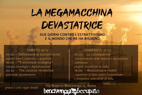 All’interno della due giorni pensiamo sia quindi importante partire da un excursus storico ed economico sul concetto di estrattivismo, per riconoscerne il ruolo fondamentale per la sopravvivenza del dominio. Passeremo poi alle contraddizioni della “transizione ecologica”, energetica e tecnologica/digitale. Discuteremo dell’impatto ambientale, politico e sociale delle imprese estrattiviste e delle sue altre evidenti conseguenze, quali la militarizzazione dei territori, la repressione e le guerre per le risorse. Ci concentreremo poi su degli esempi di lotte e resistenze alle mire estrattiviste, per concludere poi con una riflessione su quali prospettive e modalità d’intervento, da anarchiche e anarchici, vorremmo avere nella lotta contro l’estrattivismo.