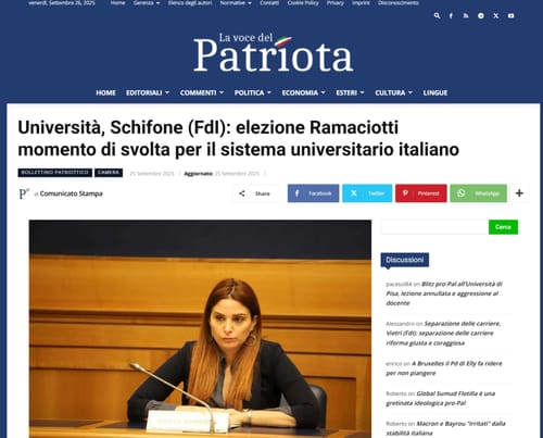 A congratularsi con la rettrice non è solo la deputata Schifone di Fratelli d’Italia dalle pagine de La voce del Patriota.