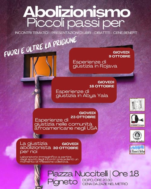 9-16-23-30 ottobre, Piazza Nuccitelli al Pigneto, alle ore 18:00 . Al termine dell'incontro, cena benefit da Zazie nel Metrò: parte del ricavato sarà devoluto all'associazione Yairaiha, che dal 2006 si impegna per contrastare il carcere e le sue violenze.