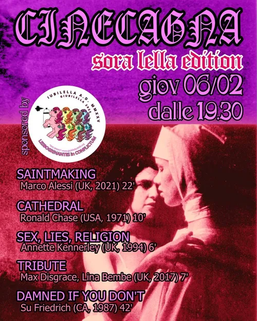 Cagne Sciolte - Monday, February 3, 2025C𝖎𝖓𝖊𝖈𝖆𝖌𝖓𝖆 presenta 𝔰𝔬𝔯𝔞 𝔩𝔢𝔩𝔩𝔞 – una raccolta di corti su lesbismo e religione (ma anche qualche gays) giovedì 6 febbraio 2025 dalle 19.30 – la proiezione inizierà alle 20 non ci sarà cibo quindi vieni già mangiatə o portati la … Continue reading →