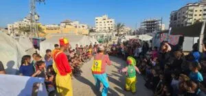 La vita nelle tende, la piccola maschera del naso rosso messa sopra la propria sofferenza e la grande stanchezza per strappare un momento di spensieratezza e dei sorrisi ai bambini gazawi.