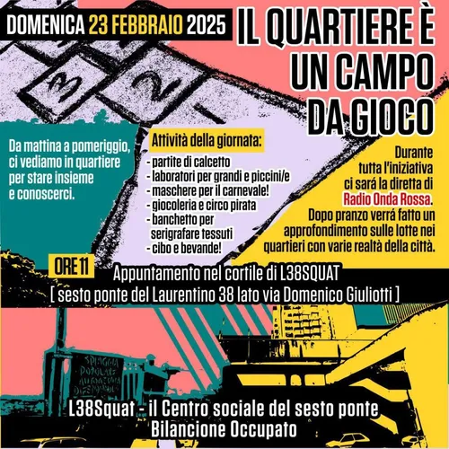 IL QUARTIERE È UN CAMPO DA GIOCO Mentre la speculazione divora i posti dove abitiamo, dal Laurentino 38 abbiamo lanciato un invito a chi lotta sul litorale di Fiumicino. Dal decreto Caivano in poi è sempre più chiaro che il governo delle periferie è sul modello carcerario. Dal Quarticciolo al Laurentino, passando per le zone … Leggi tutto "Domenica 23 febbraio – IL QUARTIERE È UN CAMPO DA GIOCO"