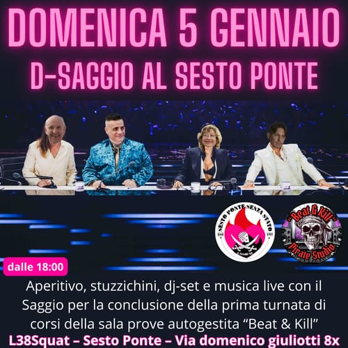 Domenica 5 Gennaio   (di)Saggio al Sesto Ponte Autogestiamo spazi e condividiamo saperi contro la speculazione nelle borgatedalle 18:00 Aperitivo, stuzzichini, dj-set e musica live con il Saggio per la conclusione della prima turnata di corsi della sala prove autogestita “Beat & Kill” L38Squat – Sesto Ponte – Via domenico giuliotti 8x912:23