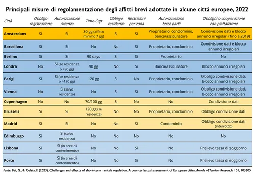 Il regolamento dovrebbe poi disciplinare la distinzione tra attività occasionale e non, dal momento che, come detto, l’art 12 bis del R.R. 8/2015 dispone che l’affitto come alloggio ad uso turistico debba essere in ogni caso “occasionale”. Tale distinzione potrà anche basarsi sulla definizione di un tetto annuale di giornate per l’affitto ai turisti, sufficientemente stringente per consentire una effettiva utilizzazione a scopo abitativo. Ci appare per altri versi eccessivamente ampio il limite dei 120 giorni che è spesso menzionato in Italia, laddove nelle città estere nelle quali è stato introdotto il cosiddetto ‘time-cap’ esso è in genere da 30 a 90 giorni, e/o associato ad altre restrizioni, quali l’obbligo di residenza (si veda la tabella).