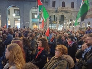 Si sono susseguiti canti e letture di poesie in un’atmosfera molto commovente. Al termine del flash mob è stato lasciato il microfono a chiunque volesse esprimere un pensiero e hanno parlato diverse persone emotivamente coinvolte: una ragazza che frequenta la terza media ha raccontato di aver potuto parlare con il suo professore di arte di quanto sta accadendo in Palestina e che era contenta di trovarsi in quella piazza in quel momento; due sorelle di origine marocchina uscite di casa poco prima su invito del corteo che le incitava a scendere in strada a protestare e a manifestare la loro vicinanza al popolo palestinese, diversi operatori sanitari che si dispiacevano e rammaricavano di quanto fosse accaduto ai loro colleghi palestinesi.