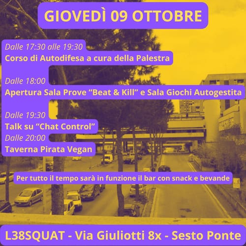 Giovedì 9 Ottobre – Corso di autodifesa, apertura sala giochi autogestita e sala prove “beat & kill”, talk su “chat control” e cena vegan Dalle 17:30Corso di Autodifesa a cura della Palestra Autogestita dello Squat Dalle 18:00Apertura Sala Giochi Autogestita, per il torneo permanente di questo mese vediamo chi mette il record più alto a … Leggi tutto "Giovedì 9 Ottobre – Corso di autodifesa, apertura sala giochi autogestita e sala prove, talk su chat control e cena vegan"