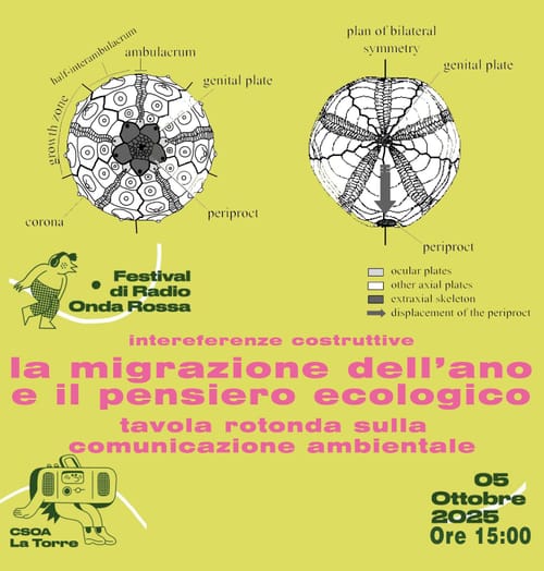 Registrazione della tavola rotonda LA MIGRAZIONE DELL’ANO E IL PENSIERO ECOLOGICO al festival "Interferenze Costruttive" di RadioOndaRossa, presso il CSA La Torre.