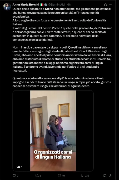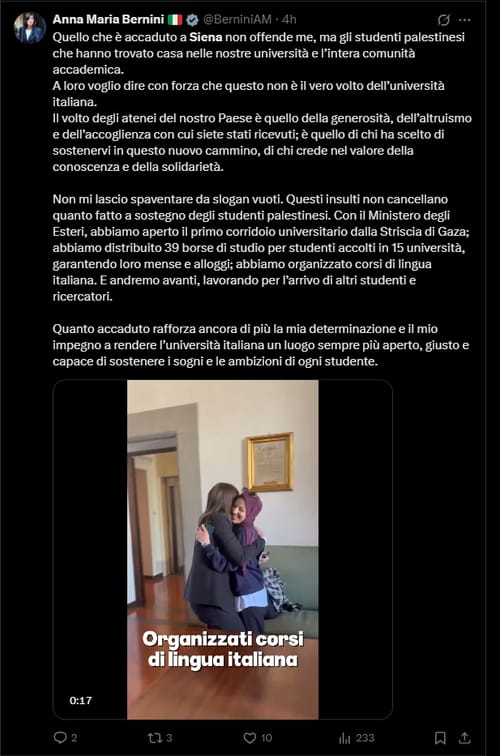 ROARS - Wednesday, October 8, 2025Nel pomeriggio del 7 ottobre si è svolta presso l’università di Siena una cerimonia di accoglienza per 5 studentesse e 1 studente palestinese. Alla cerimonia era presente la ministra Anna Maria Bernini che nel cortile del rettorato è stata contestata da studentesse, studenti, cittadine e cittadini con bandiere palestinesi. Nella serata la ministra ha diffuso un comunicato sui social (Instagram, Facebook, X) accompagnato da un un video accuratamente montato che potete vedere qui sotto. Il coordinamento del precariato dell’università di Siena ha diffuso un documento in cui il video è descritto come un “caso esemplare di propaganda istituzionale rozza e regressiva, costruita su una retorica oppositiva che divide da una parte gli studenti e le studentesse che contestano, additati come il “male” dell’università e, paradossalmente, come nemici della Palestina; dall’altra, il governo, autoproclamatosi difensore della libertà e dei diritti umani”.