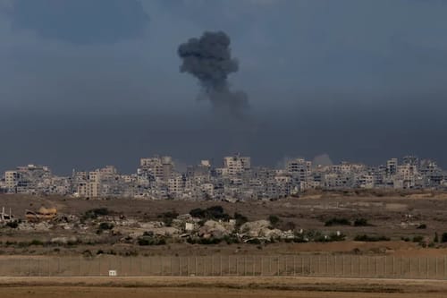 Il fumo sale sopra la Striscia di Gaza dopo un bombardamento israeliano, il 7 ottobre 2025, visto dal sud di Israele [Amir Levy/Getty Images]