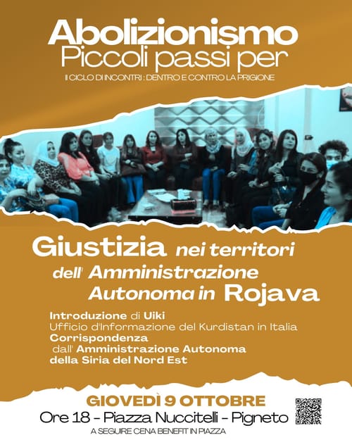 Radio Onda Rossa - Thursday, October 9, 2025Con l'associazione Yairaiha parliamo del primo incontro del III ciclo "Fuori e oltre la prigione" previsto per il 9 ottobre, presso Zazie nel Metrò (via Ettore Giovenale, 16) alle ore 18:00. Si parlerà di giustizia nei territori dell'amministrazione autonoma in Rojava con Uiki (Ufficio Informazione Kurdistan in Italia) e in corrispondenza con l'Amministrazione Autonoma della Siria del Nord Est.