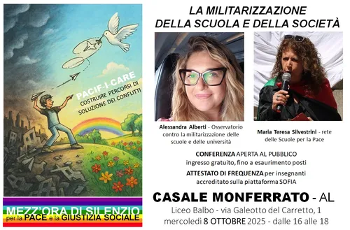 Osservatorio contro militarizzazione di scuole e università - Sunday, October 12, 2025Mercoledì 8 ottobre a Casale Monferrato (AL) presso l’Aula Magna del liceo Balbo si è svolto l’incontro pubblico sul tema “La Militarizzazione della Scuola e della Società” nell’ambito del programma PACIF-I-CARE: Costruire percorsi di soluzione dei conflitti.