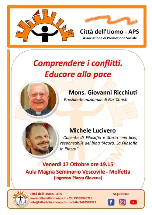 Si terrà venerdì 17 ottobre2025 alle ore 19:15 presso l’Aula Magna del Seminario Vescovile di Molfetta (ingresso da Piazza Giovene) la presentazione del libro Comprendere i conflitti. Educare alla pace, volume che raccoglie gli atti del I Convegno nazionale dell’Osservatorio contro la militarizzazione delle scuole e delle università.