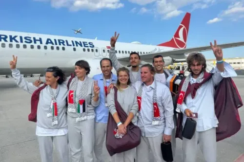 MEMO. Un volo della Turkish Airlines (THY) ha portato 94 attivisti, tra cui 18 Turchi, della Freedom Flotilla Coalition, sequestrati da Israele in acque internazionali, a Istanbul in Turchia, il 10 ottobre 2025.