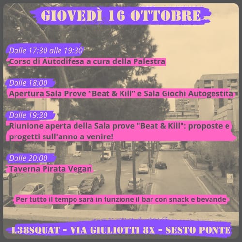 Giovedì 16 Ottobre – Assemblea pubblica per organizzare i corsi e le attività della sala prove, corso di autodifesa, sala giochi autogestita e taverna pirata vegan
