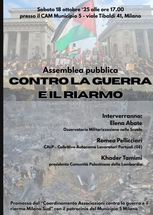 Si terrà sabato 18 ottobre 2025, ore 17.00 presso il CAM del Municipio 5 in via Tibaldi n. 41 a Milano l’assemblea pubblica organizzata dal Coordinamento Associazioni contro la guerra e il riarmo Milano Sud.