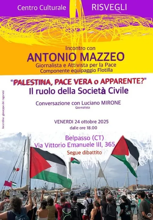 #stopthegenocideingaza🇵🇸 #Belpasso (Catania), venerdì 24 ottobre, ore 18. "#Palestina, pace vera o apparente? Il ruolo della Società Civile". Incontro con Antonio Mazzeo attivista per la Pace, componente equipaggio della #Freedom #Flotilla. Conversazione con Luciano Mirone.