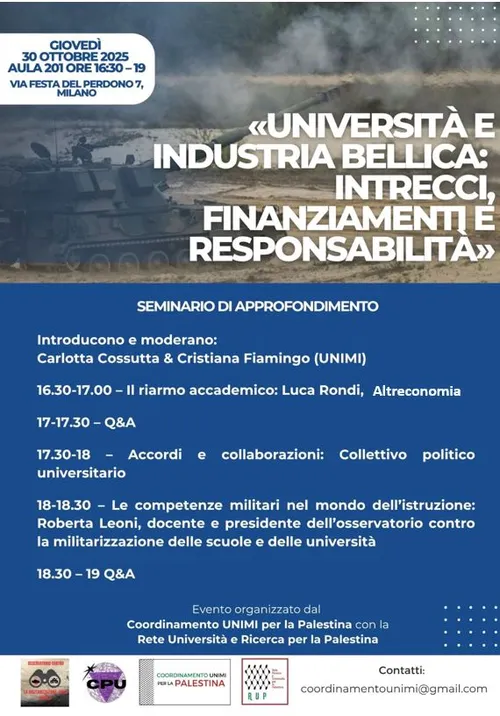 Si svolgerà giovedì 30 ottobre 2025 a Milano dalle ore 16:30 alle ore 19 presso l’aula 201 dell’Università Statale di Milano il Seminario dal titolo “Università e industria bellica: intrecci, finanziamenti e responsabilità”. L’evento è organizzato dal Coordinamento UNIMI per la Palestina in collaborazione con Rete Università e Ricerca per la Palestina e l’Osservatorio contro la militarizzazione delle scuole e delle università.