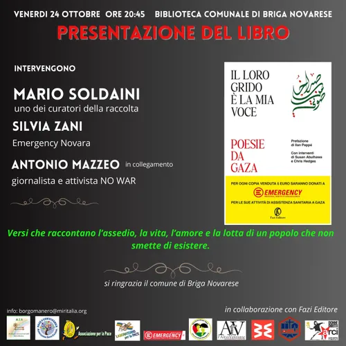 Antonio Mazzeo - Thursday, October 23, 2025#stopthegenocideingaza🇵🇸 Venerdì 24 ottobre alle 20:45 nella biblioteca di #Briga Novarese (#Novara) si terrà la presentazione del libro "Il loro grido è la mia voce. Poesie da #Gaza" di Fazi Editore alla presenza di uno dei tre giovani curatori della raccolta, Mario Soldaini.