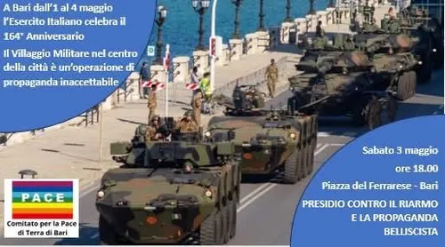 A BARI DALL’1 AL 4 MAGGIO L’ESERCITO ITALIANO CELEBRA IL 164° ANNIVERSARIO L’ALLESTIMENTO DI UN “VILLAGGIO MILITARE” NEL CUORE DELLA CITTÀ È UN’OPERAZIONE DI PROPAGANDA INACCETTABILE