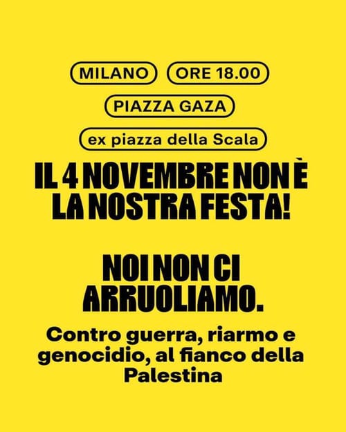 Oggi più che mai, ribadiamo che il 4 novembre non è una nostra festa e che non faremo passare questo becero tentativo di strumentalizzare questa data per giustificare il piano di riarmo dell’Unione Europea, la finanziaria di guerra del governo Meloni e il genocidio in corso in Palestina.
