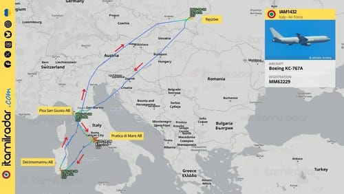 Il sito specializzato ItaMilRadar ha tracciato lunedì 26 ottobre 2025 il volo di un grande aereo cargo KC-767A in dotazione al 14° Stormo dell'Aeronautica Militare di Pratica di Mare (Roma) che dalla base aerea NATO di Decimomannu in Sardegna ha raggiunto lo scalo polacco di Rzeszów, il maggiore hub della NATO per i rifornimenti di armi, munizioni e mezzi di guerra alle forze armate ucraine in guerra contro la Russia.