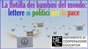 Mai come oggi, l’infanzia è minacciata da guerre che minano il suo diritto a vivere e crescere in pace. Serve una decisa e diffusa Educazione alla pace. Il Gruppo Educazione alla pace e alla nonviolenza del MCE lancia: la Flotilla dei bambini del mondo: lettere ai politici per la pace, insieme ad oltre 40 associazioni di insegnanti di tutto (Federazione Internazionale dei Movimenti di Scuola Moderna -Fimem). Si invitano bambini e ragazzi a preparare una loro Flotilla di lettere da inviare ai politici e ai potenti della terra; consiglieri comunali e regionali, parlamentari di Camera e Senato, Presidente della Repubblica e del Consiglio dei Ministri, Parlamentari europei, l’Assemblea generale dell’ONU, e diversi Capi di Stato e così via. Cosa fanno loro per la Pace?