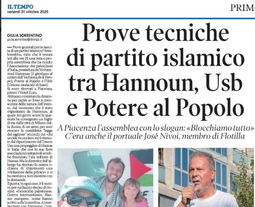 Contropiano - Sunday, November 2, 2025Da alcune settimane il quotidiano storico della destra di palazzo, “Il Tempo”, grida allarmato verso le iniziative comuni tra esponenti marxisti ed esponenti islamici in Italia. In particolare starnazza per alcune assemblee o attestati di solidarietà di organizzazioni politiche e sindacali verso Mohammed Hannoun, rappresentante dell’Associazione Benefica di Solidarietà con […]