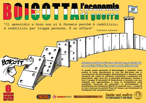 In questa serata parleremo di Boicottaggio e Inchieste come pratica di Lotta. Ascolteremo le voci del Bds_Roma che ci racconteranno del Boicottaggio, Disinvestimento e Sanzioni come strumenti per colpire le economie colonialiste e predatorie che partecipano, oggi come ieri, al genocidio palestinese. Insieme a lor@, il gruppo di lavorator@ di Cobas-Poste ci illustrerà una loro inchiesta che approfondisce il ruolo di PosteItaliane nella cosiddetta “economia del genocidio”: la partecipazione di PosteItaliane alla fondazione Med-Or di Leonardo s.p.a., i trasporti di merci dual-use da partedi Poste Air Cargo e gli investimenti di Fondoposte nell’ economia di guerra.