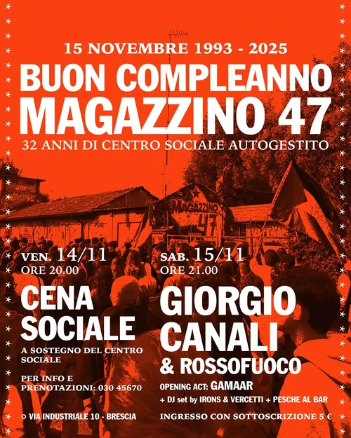 Venerdì 14 e sabato 15 novembre 2025 festeggiamo insieme in via Industriale, 10 a Brescia, il 32esimo compleanno del Magazzino 47, una storia collettiva fatta di lotte sociali e politiche, discussione, pensiero critico, autogestione, cultura e musica!
