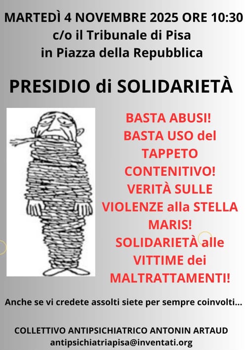 La giudice infatti con molta probabilità pronuncerà la sentenza di primo grado dopo aver ascoltato la risposta del pubblico ministero alla requisitoria degli avvocati delle due dottoresse imputate esposta nel corso della precedente udienza. Come collettivo antipsichiatrico Antonin Artaud saremo presenti martedì 4 novembre a partire dalle ore 10:30 per il ventiduesimo presidio davanti al Tribunale di Pisa, in sostegno e solidarietà alle famiglie delle vittime dei maltrattamenti.